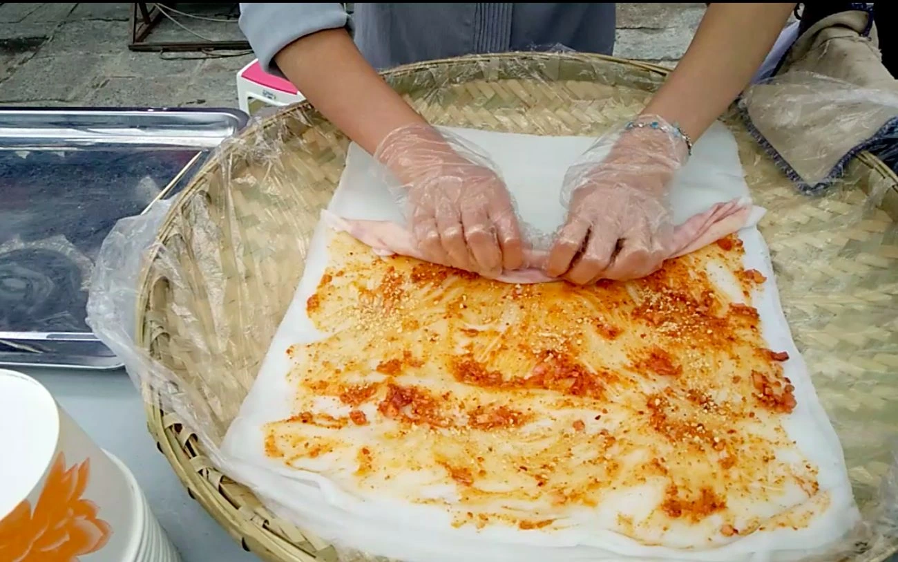 The Yangbi Rice Rolls are a feast for the eyes as much as they are for the palate. The rolls are characterized by their smooth, almost translucent skin that glistens with a subtle sheen, hinting at the succulent filling within. The rolls are often cut into bite-sized pieces, revealing the contrasting colors of the meat and the rice skin, which adds to their visual appeal.