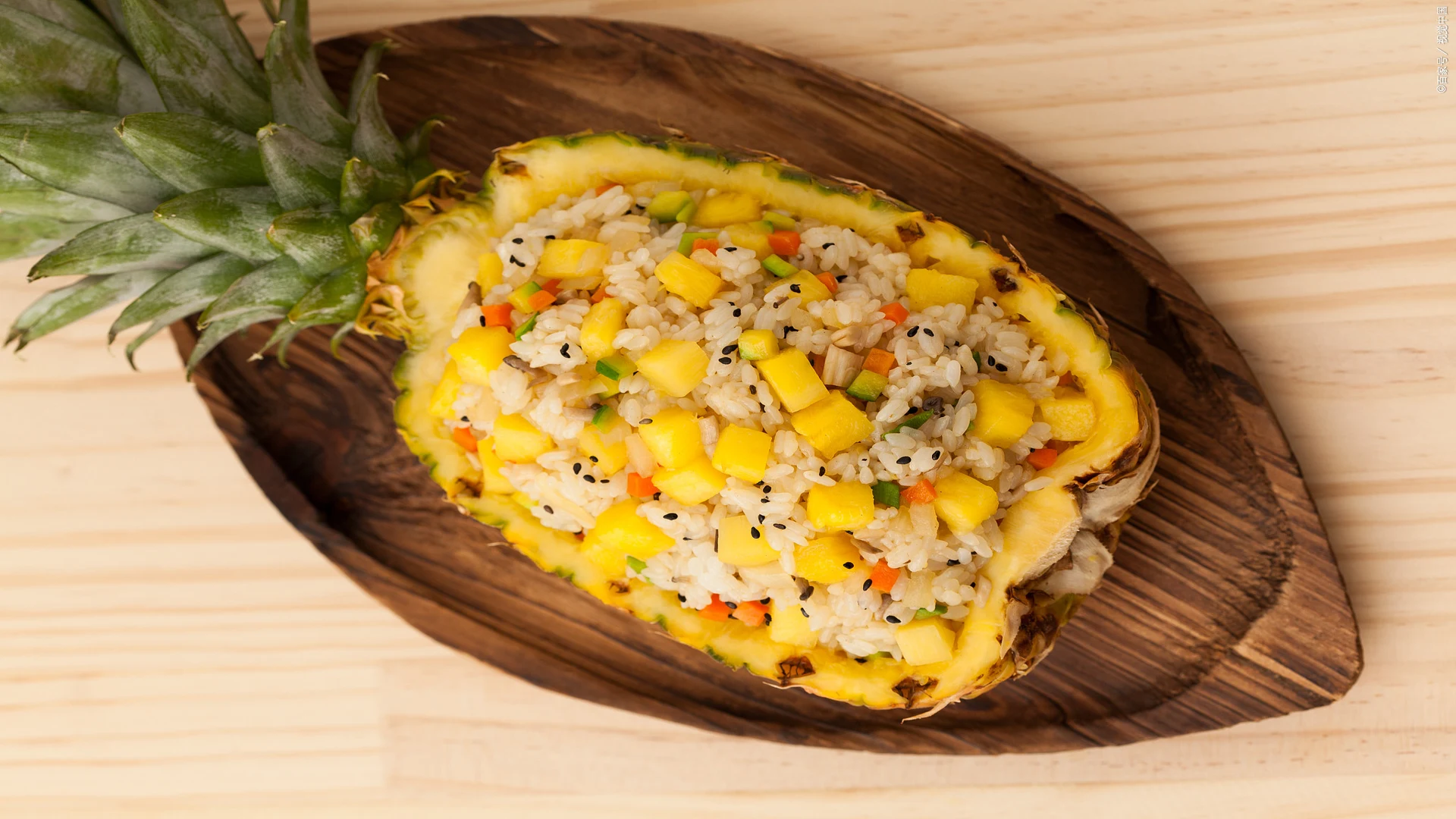 2. Fresh Pineapple: The pineapple is the vessel that holds the rice. It is chosen for its sweetness and juiciness, which infuse the rice with a natural, fruity essence.