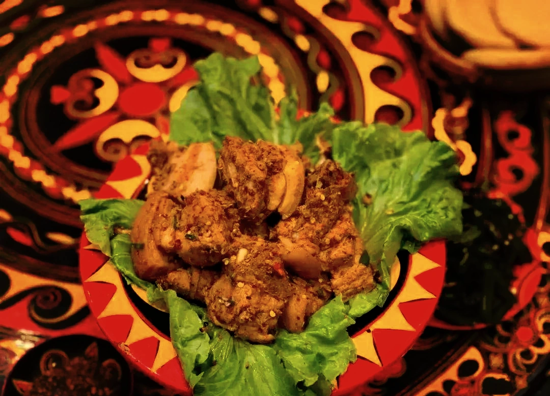 The Yi Family’s Tuotuo Meat is a sight to behold. 一旦解开, the pig is a golden brown, with the skin slightly charred in places, giving it a rustic and appetizing look. The aroma that wafts from the meat is intoxicating, a blend of smoky, herbal, and meaty notes that promise a feast for the senses.