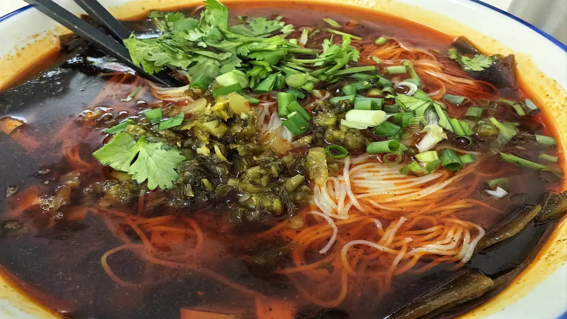 Visuellement, Mianyang Rice Noodles are a feast for the eyes. The noodles are presented in a delicate, almost translucent form, often served in a bowl with a rich, red sauce that glistens with oil. The dish is garnished with fresh green onions, cilantro, and sometimes a sprinkle of sesame seeds, adding a pop of color and texture to the dish.