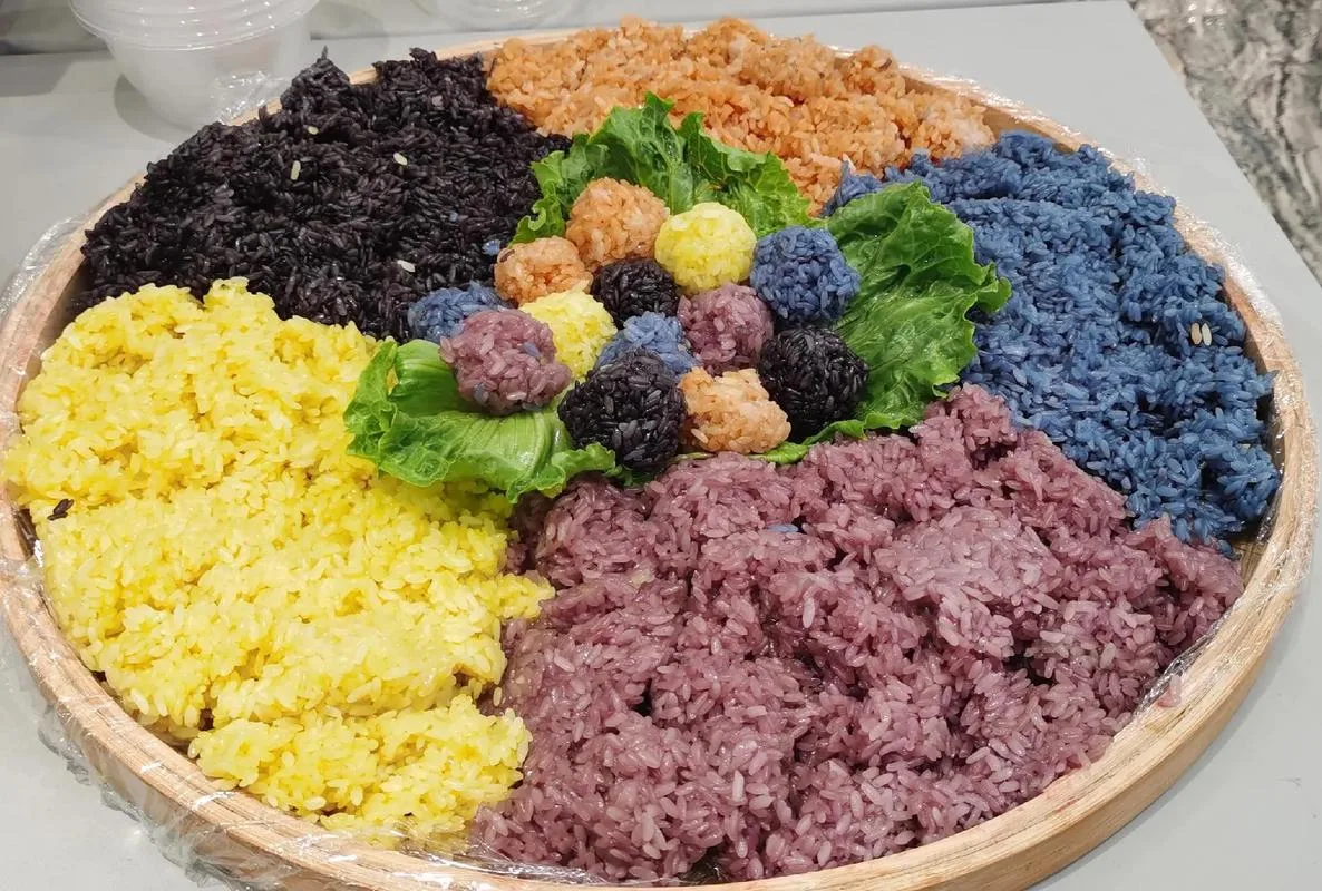These dyes are carefully prepared and used to soak the glutinous rice overnight, allowing the colors to permeate the grains. The rice is then steamed to perfection, resulting in a dish that is not only visually stunning but also packed with a variety of flavors.