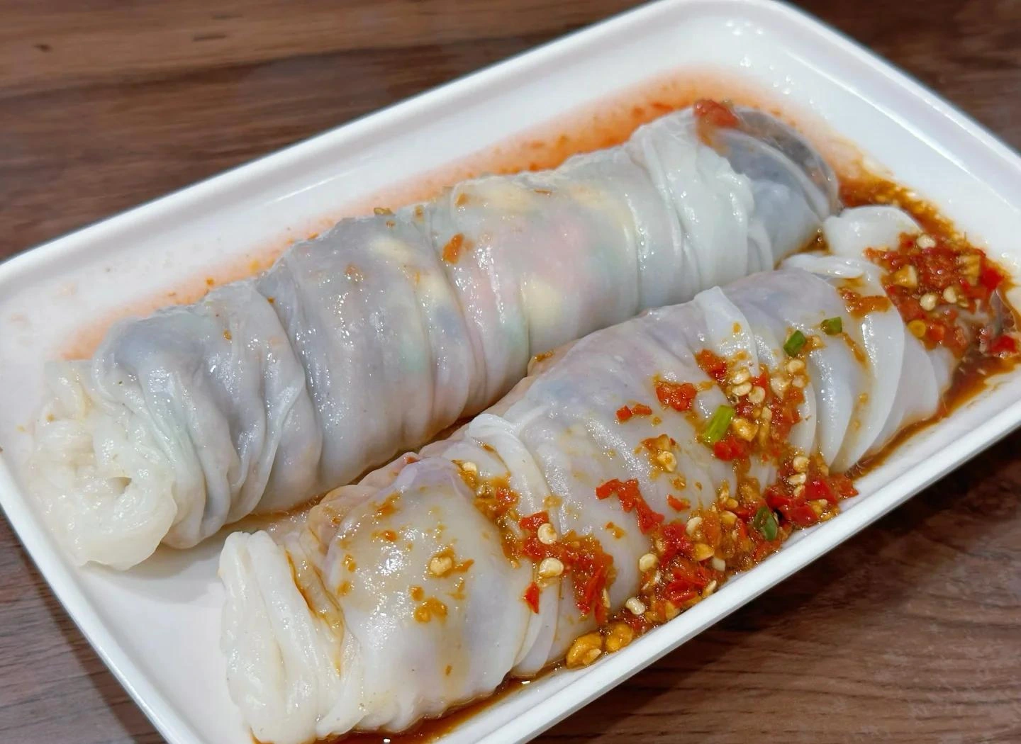 The final product is a cylindrical roll with a glistening, translucent outer layer that reveals hints of the filling within. The roll is then cut into smaller segments, each piece showcasing the contrast between the delicate, slightly chewy rice skin and the savory, rich filling. 演讲简单而优雅, often garnished with fresh herbs and a drizzle of the special sauce that complements the dish.